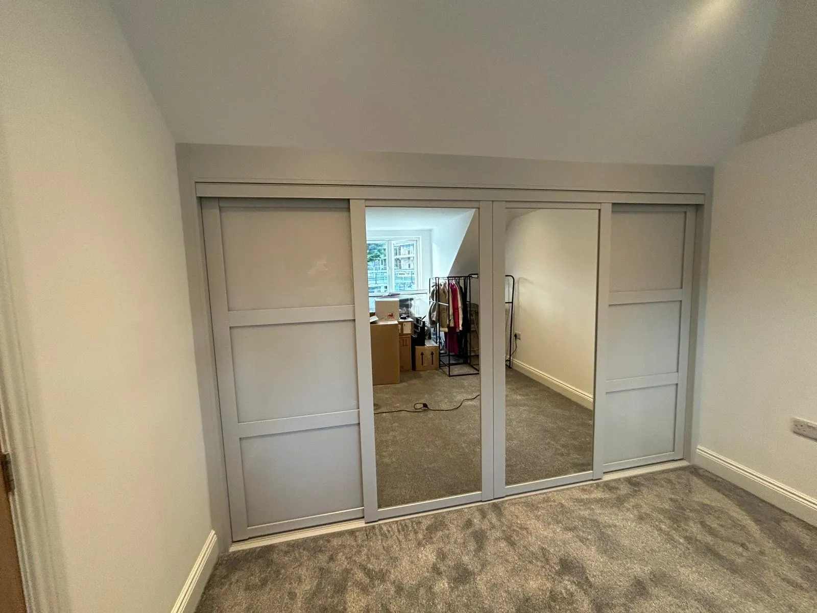 Light grey wall boxed ends and top infill to sloping ceiling.